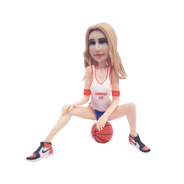 Car-mounted custom bobblehead doll of woman sitting on basketball -