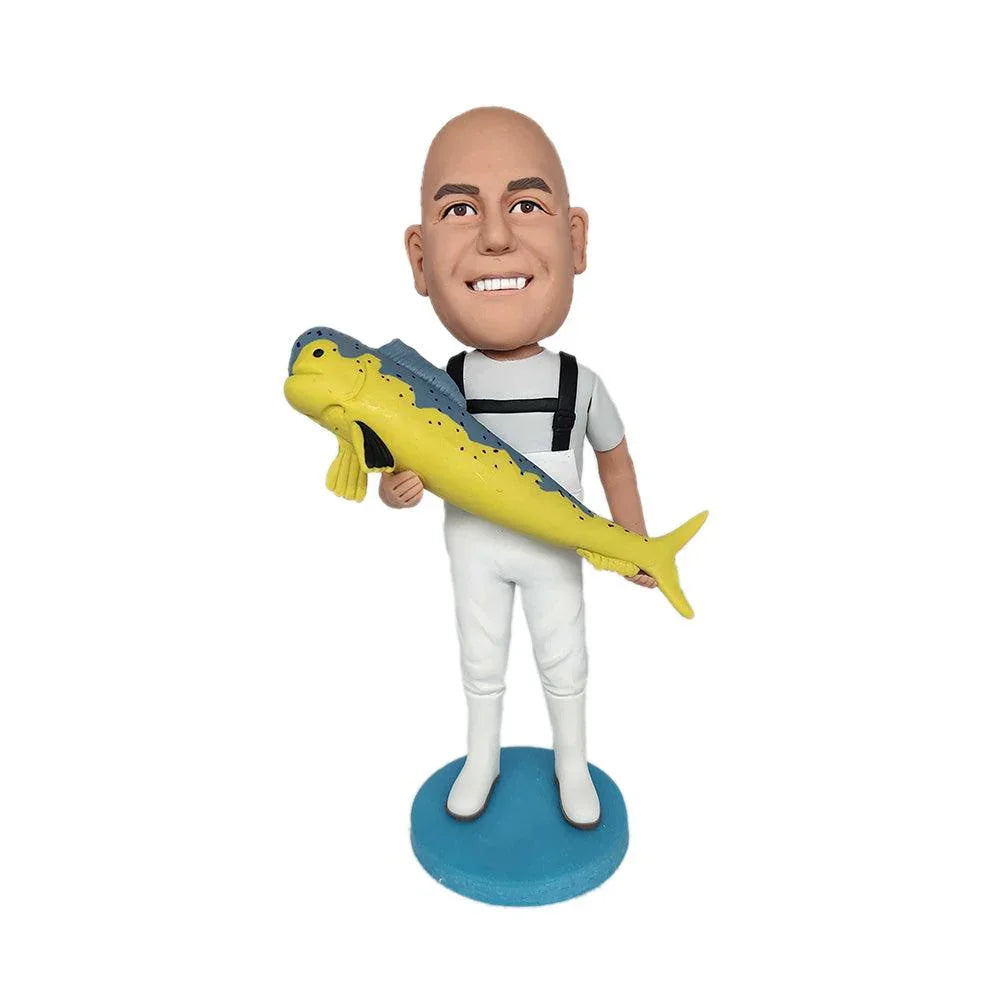 Sea Angler Holding Fish Bobblehead personnalisé avec texte gravé
